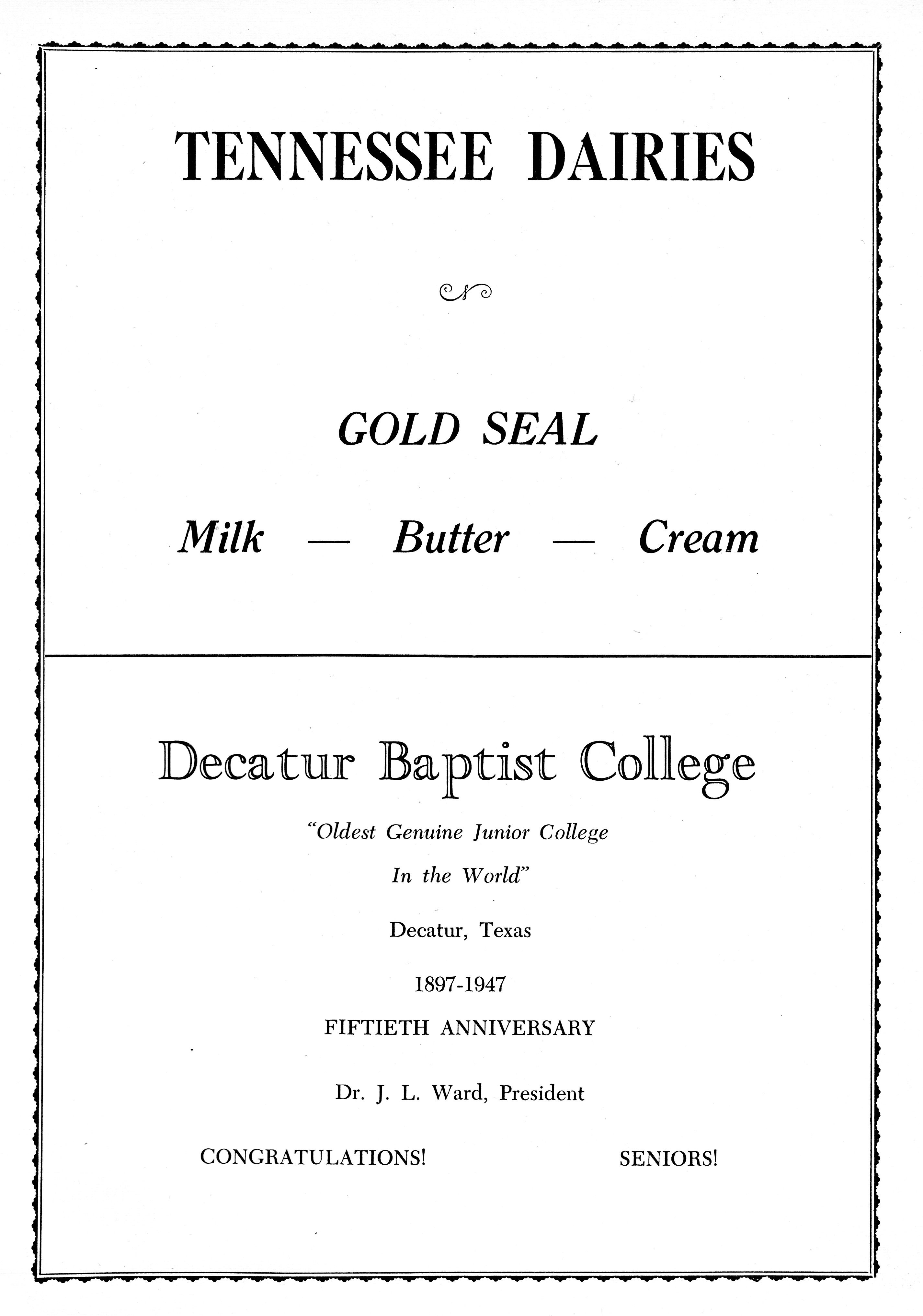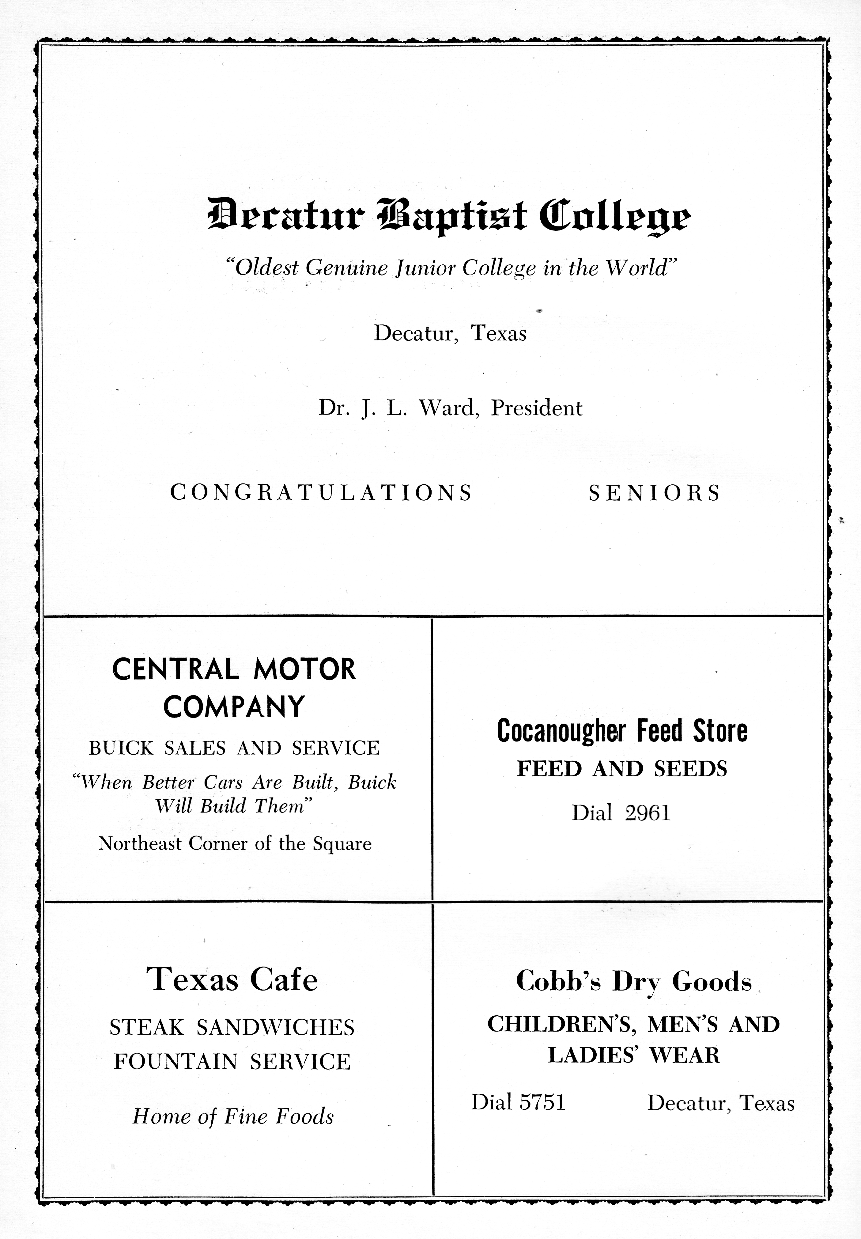 Decatur Baptist College - Dr. J.L. Ward 1949 DHS Advertisement